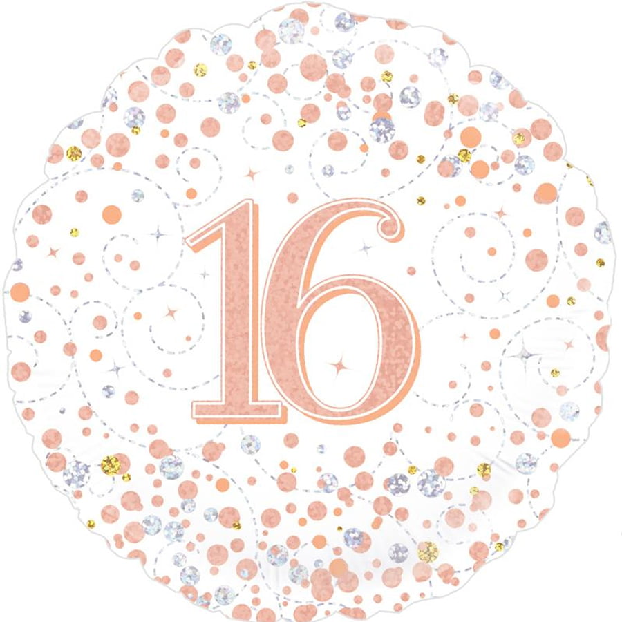 De ballon heeft als basis een witte kleur met het getal 16 erop in een roségouden kleur en daar omheen rosé & goudkleurige stippels.