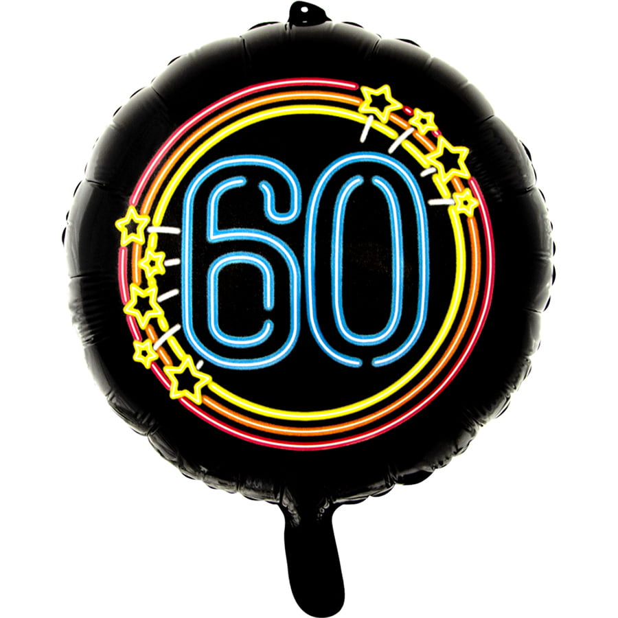 Feliciteer een 60 jarige met deze stoere, ronde, zwarte heliumballon met neonkleurige cijfers en strepen in de stijl van de sixties. Ook leuk als versiering op een jubileum of verjaardagsfeest!