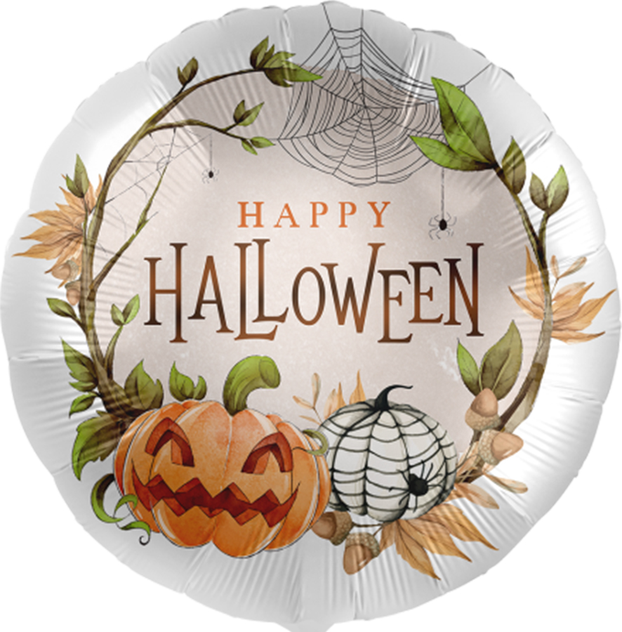 Breng de perfecte mix van griezelig en sfeervol naar je Halloweenfeest met deze Happy Halloween ballon. Versierd met pompoenen, spinnenwebben, en herfstbladeren, geeft deze ballon je feest een gezellige maar spookachtige uitstraling. Ideaal voor Halloween-themafeesten, trick-or-treat avonden of om je huis te versieren voor de feestdagen.