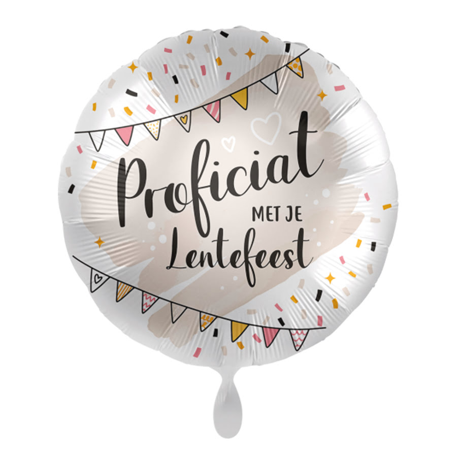 De ballon heeft als basis een witte, satijnachtige look met in sierlijke, zwarte letters de tekst “Proficiat met je Lentefeest” op een pastelroze achtergrond. Verder ziet de ballon er erg vrolijk uit door de afgebeelde gekleurde vlaggetjes en confetti. Onopgeblazen heeft de ballon een doorsnede van 43 cm.