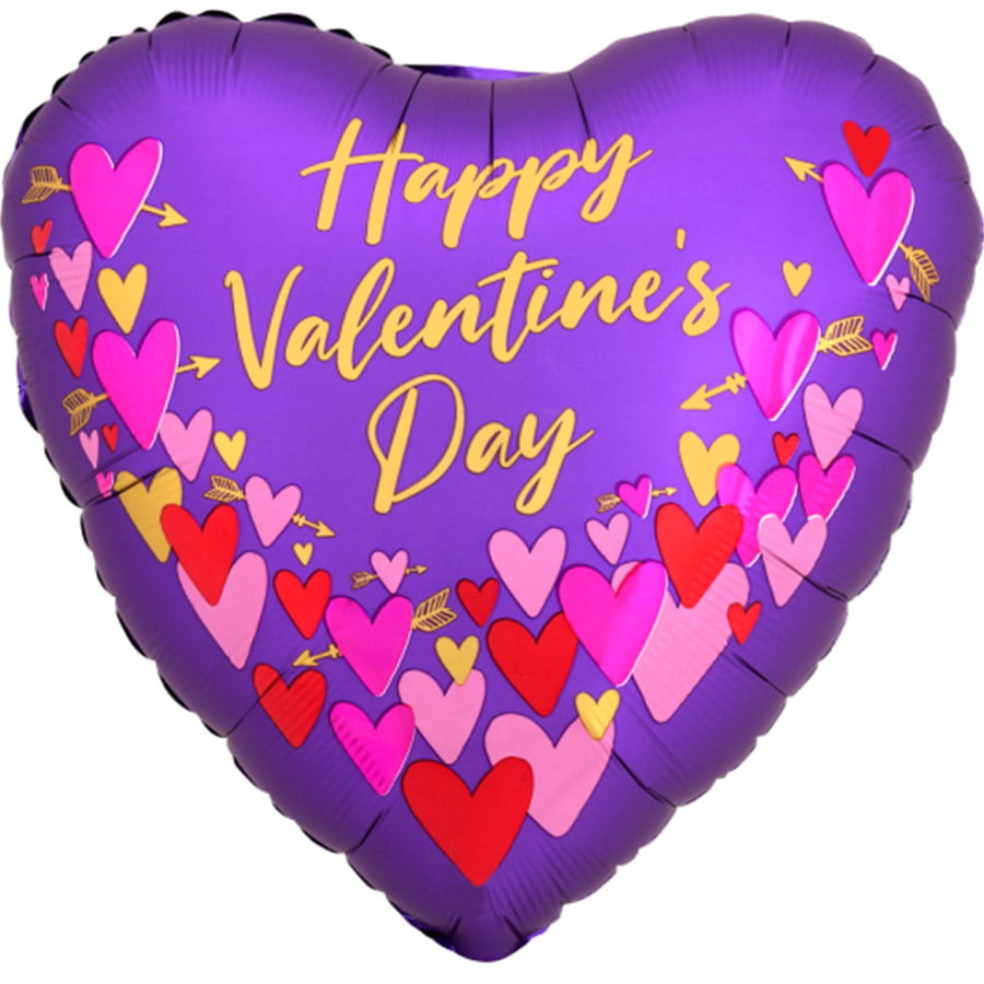 Verras jouw Valentijn met deze paarse ballon met rode en roze hartjes met pijltjes en de tekst “Happy Valentine’s Day”. Cupido schiet vast raak!