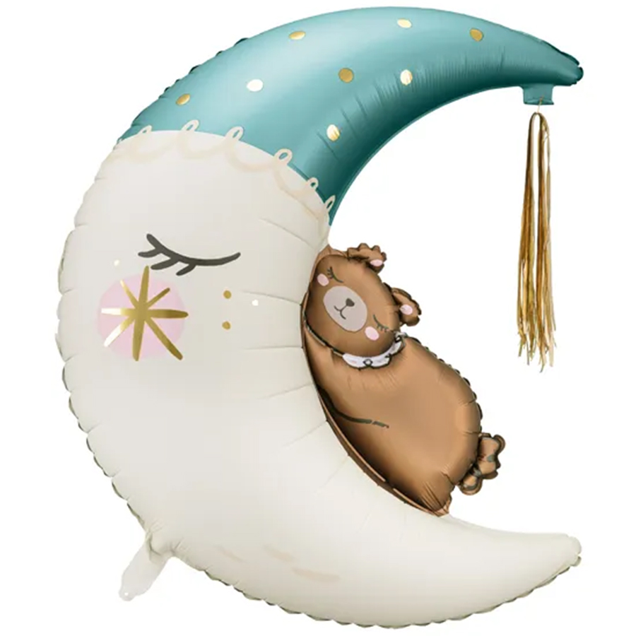 Deze prachtige Maan en Beer ballon in een zachte blauwe kleur is perfect voor een babyshower, kinderverjaardag of elk feest met een dromerig thema. De ballon toont een schattige beer die knus tegen een glimlachende maan aanligt, en de zachte blauwe tinten voegen een rustige en serene sfeer toe aan je feestdecoratie. Perfect om een vleugje magie en zachtheid toe te voegen aan elk evenement.
